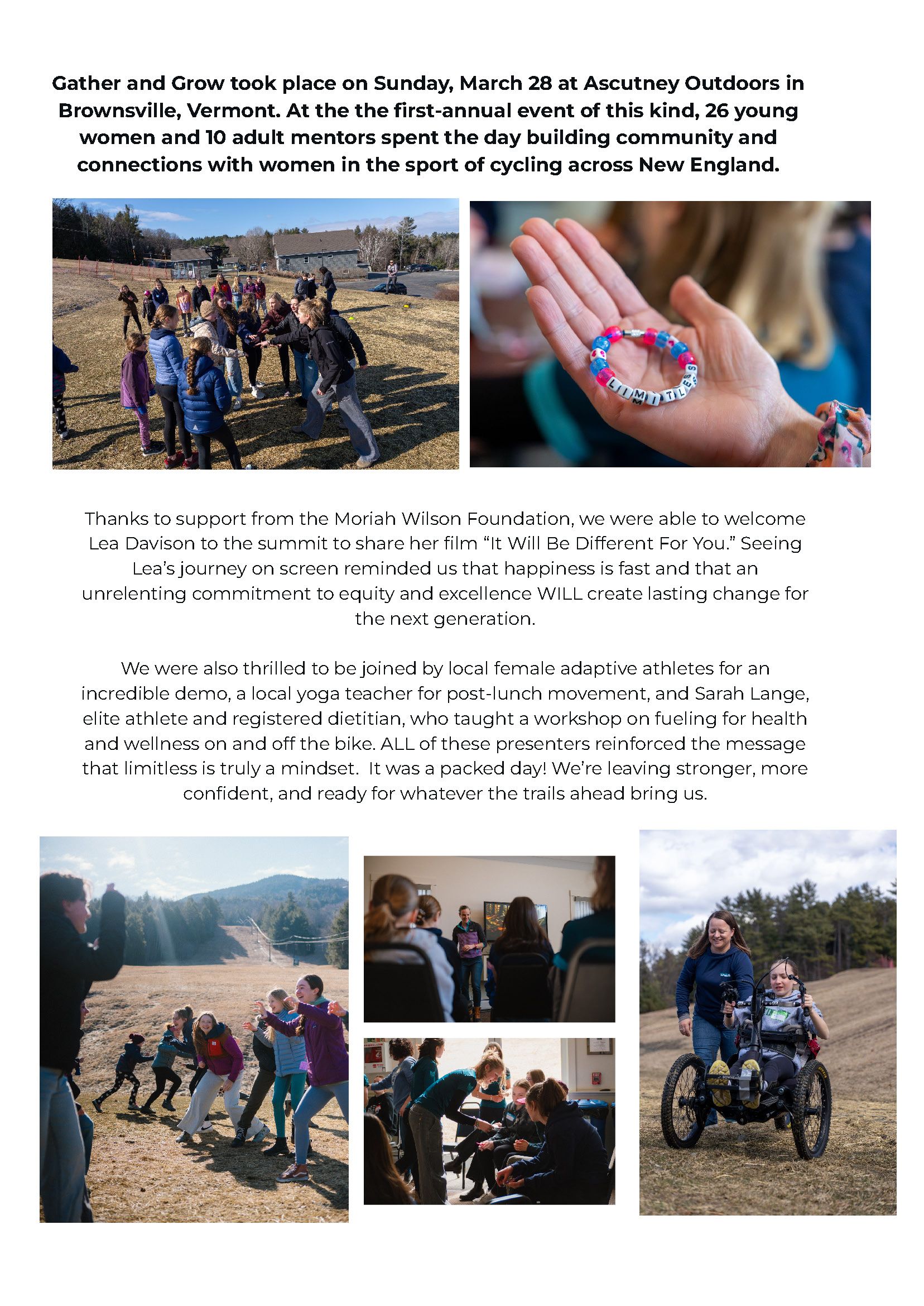 Thanks to support from the Moriah Wilson Foundation, we were able to welcome Lea Davison to the summit to share her film “It Will Be Different For You.” Seeing Lea’s journey on screen reminded us that happiness is fast and that an unrelenting commitment to equity and excellence WILL create lasting change for the next generation. We were also thrilled to be joined by local female adaptive athletes for an incredible demo, a local yoga teacher for post-lunch movement, and Sarah Lange, elite athlete and registered dietitian, who taught a workshop on fueling for health and wellness on and off the bike. ALL of these presenters reinforced the message that limitless is truly a mindset. It was a packed day! We’re leaving stronger, more confident, and ready for whatever the trails ahead bring us.